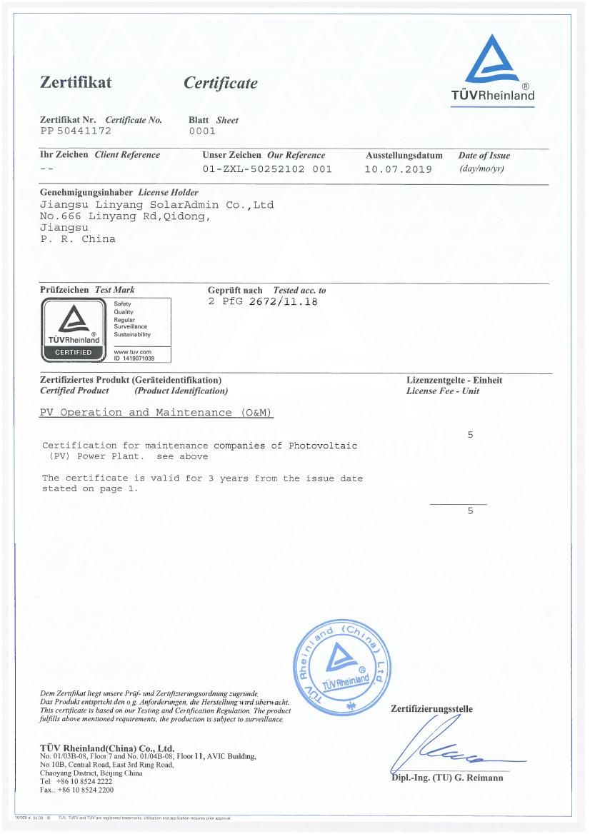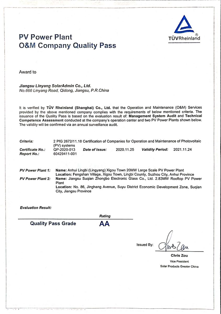 公司秉承“安全第一、运行可靠、效益为先、长期受控”的运维方针,专注于新能源电站运维业务,在新能源电站智能化运行、设备维护检修试验、系统效率检测评估、场站技改优化、电站资产托管等方面为客户提供优质的解决方案。公司现有员工超过800人,一线技术人员均经过严格的行业培训,并具有3年以上新能源电站现场运维生产管理经验,专业持证率100%。