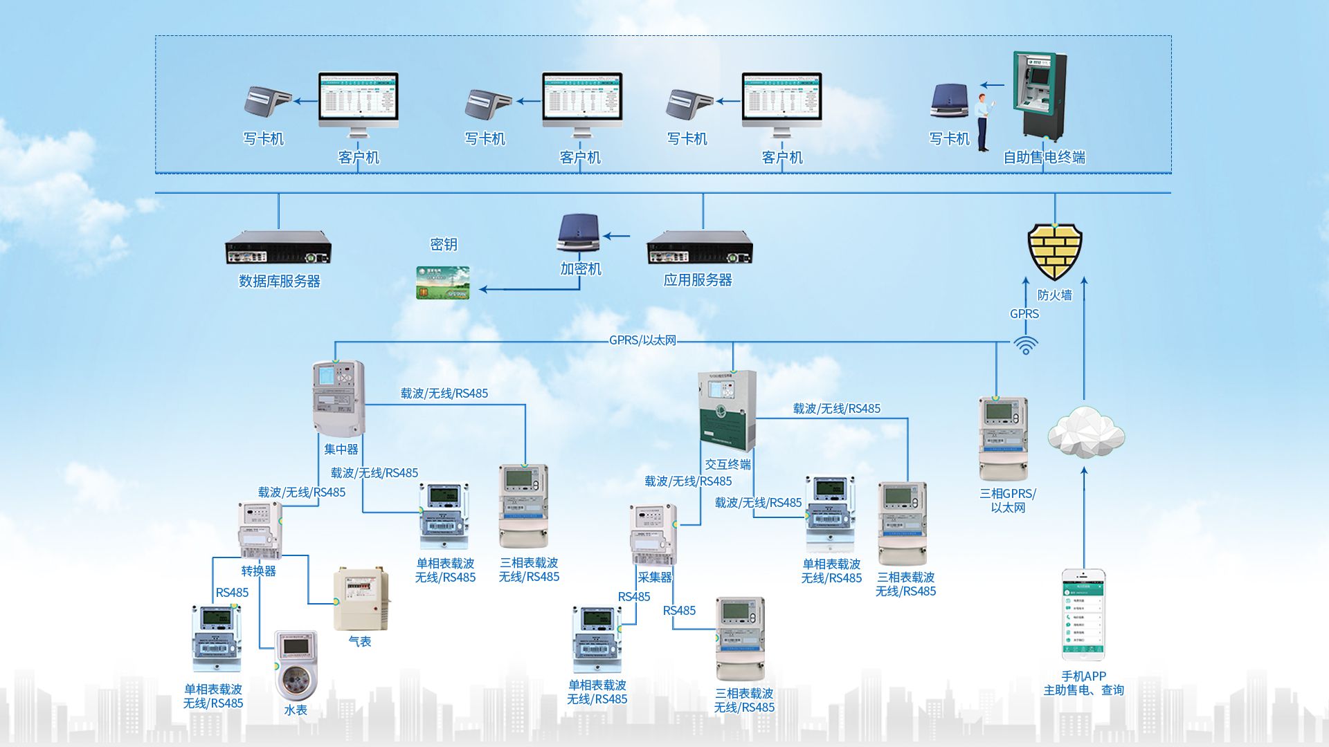 主站服务器、主站系统、写卡机、加密机、短信猫、集中器、交互终端、助交费终端